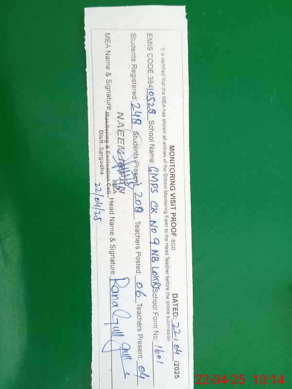 | EMIS Code: 38410528 | Name of School: GMPS CHAK NO.9 NB LOKRI | |||