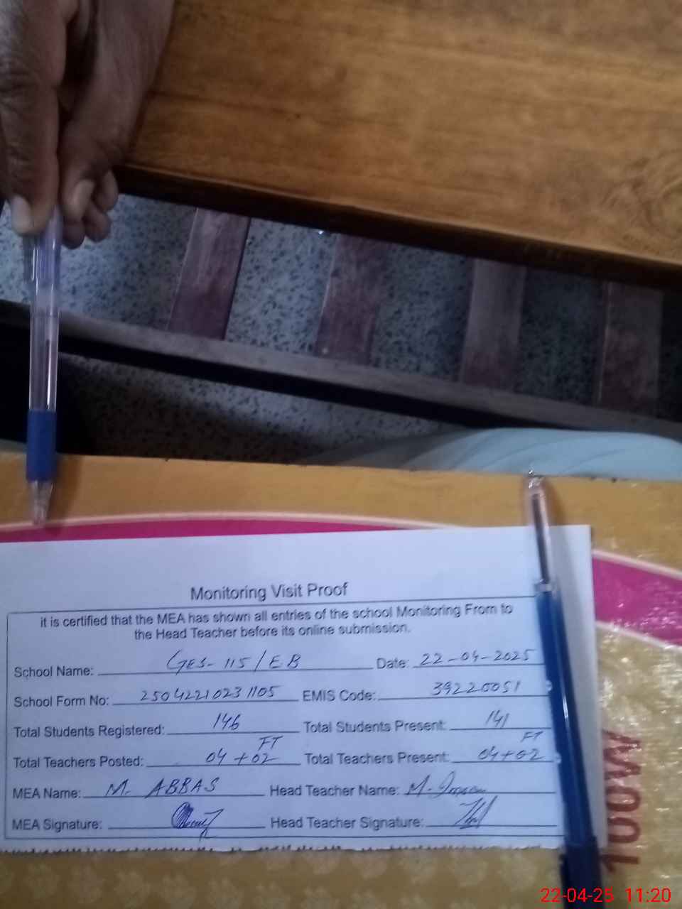 | EMIS Code: 39220051 | Name of School: GES 115 EB ARIF WALA | |||