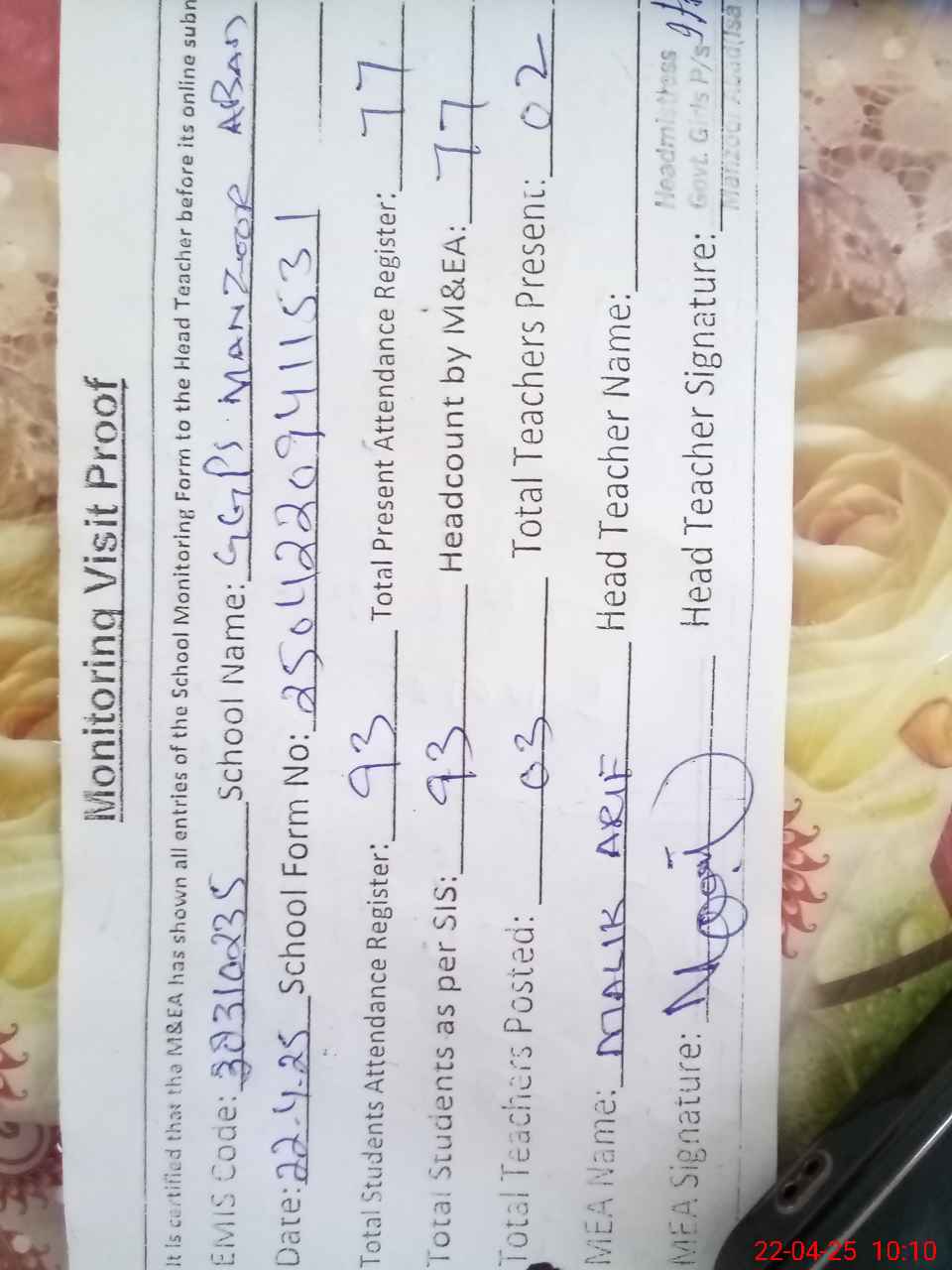 | Attendance Register | Head Teacher | MEA with School | Visit Proof |