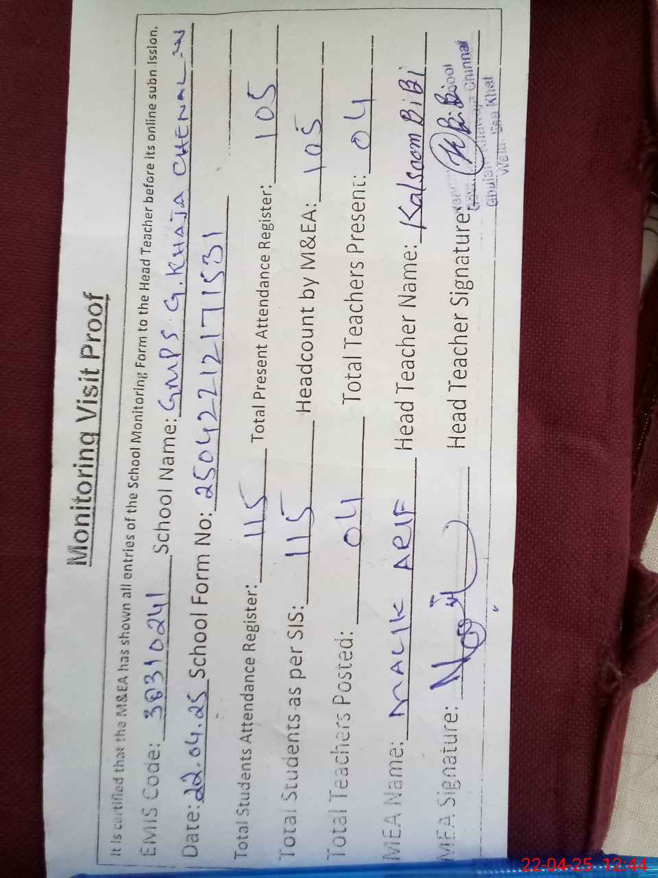 | Attendance Register | Head Teacher | MEA with School | Visit Proof |