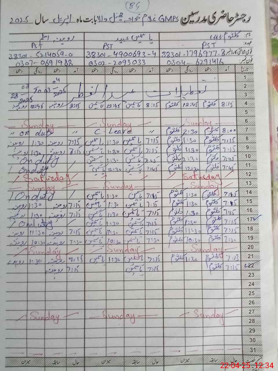 | CNIC | Full Name | Designation | R/C | Absence During Last Calender Month |