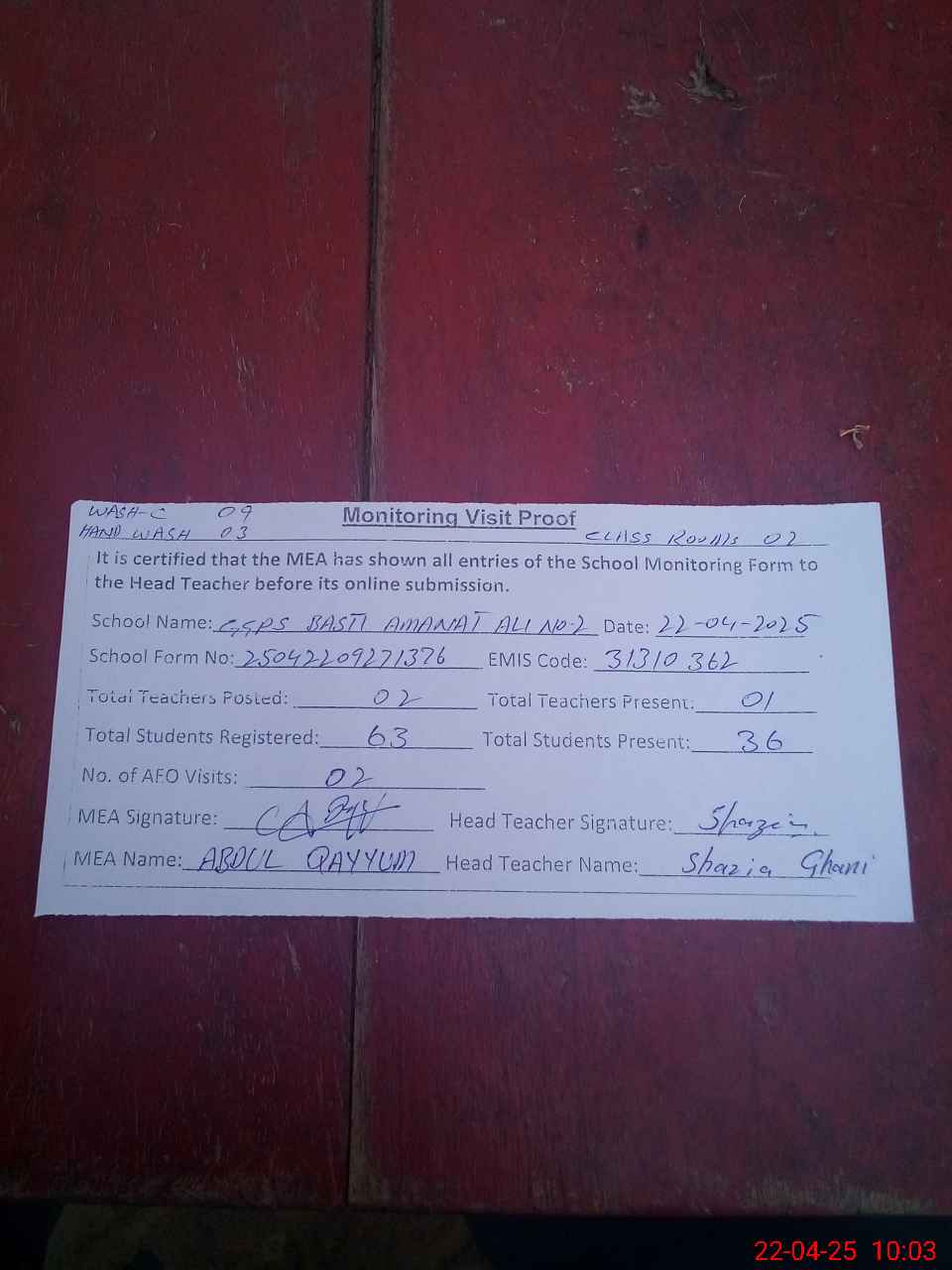 | EMIS Code: 31310362 | Name of School: GGPS BASTI AMANAT ALI NO 2 | |||