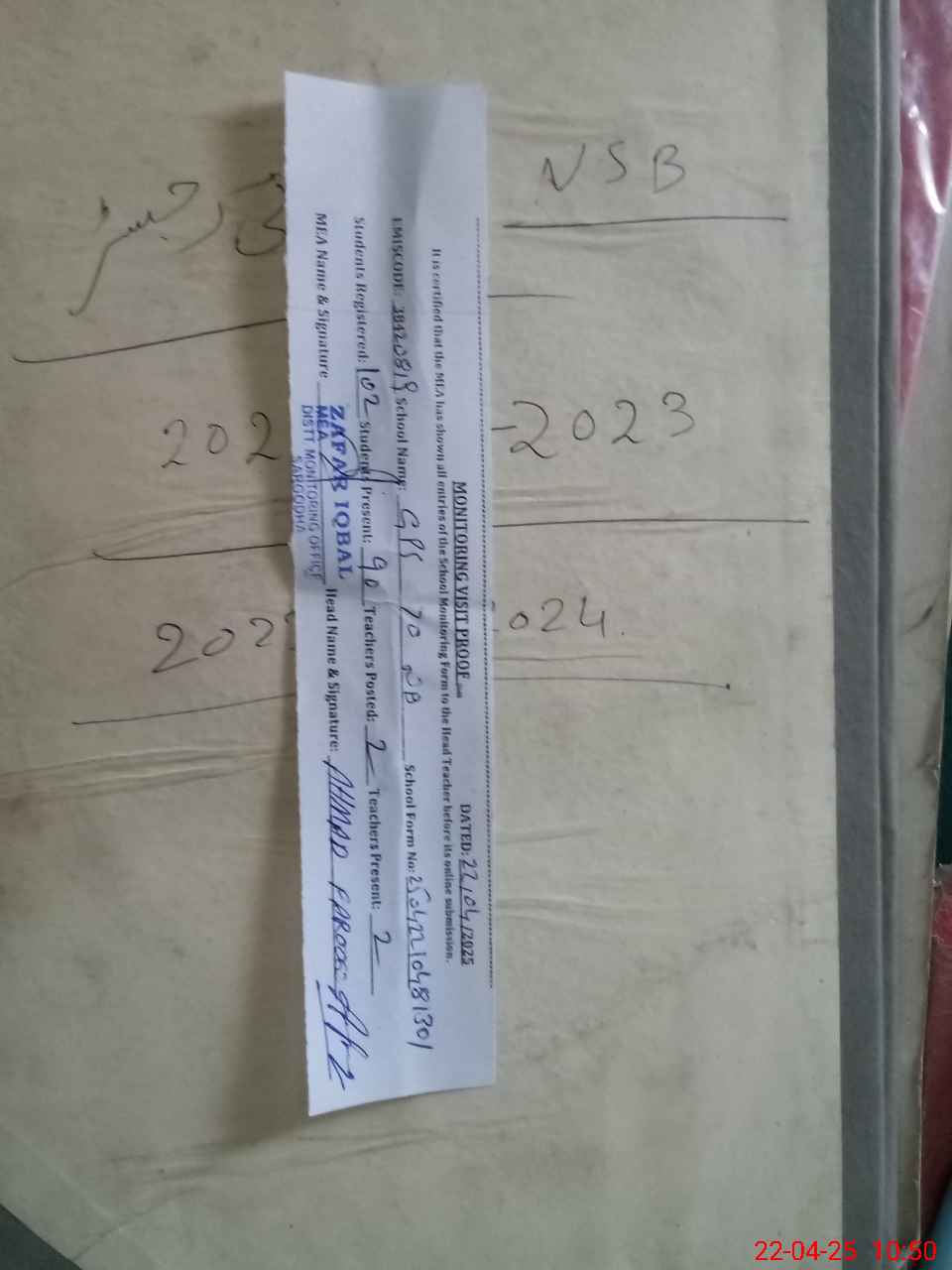 | Certified that this School was Inspected by the Undersigned MEA/DMO Today and the Information Stated Above is as Per Record. | |||||