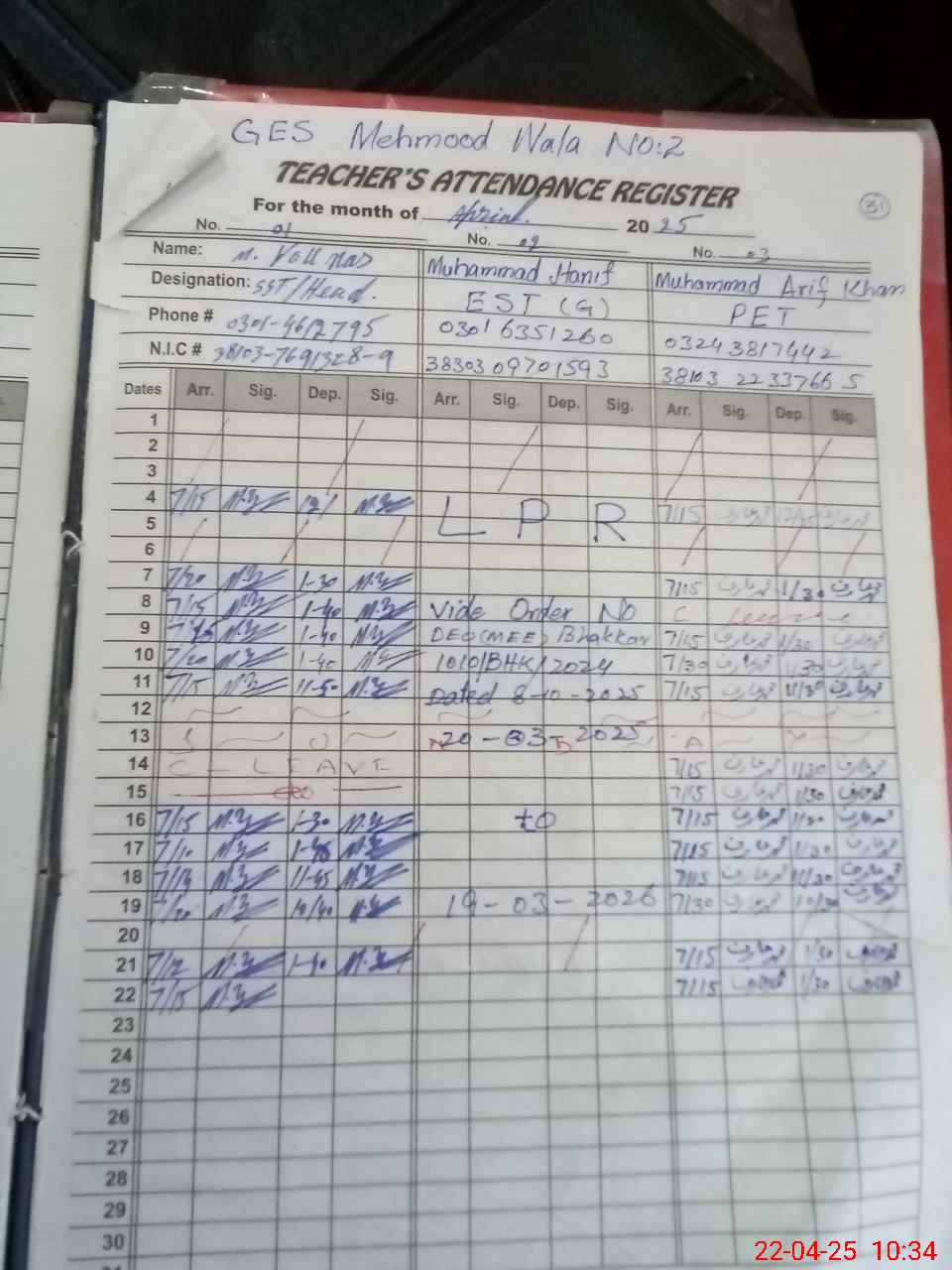 | CNIC | Full Name | Designation | R/C | Absence During Last Calender Month |