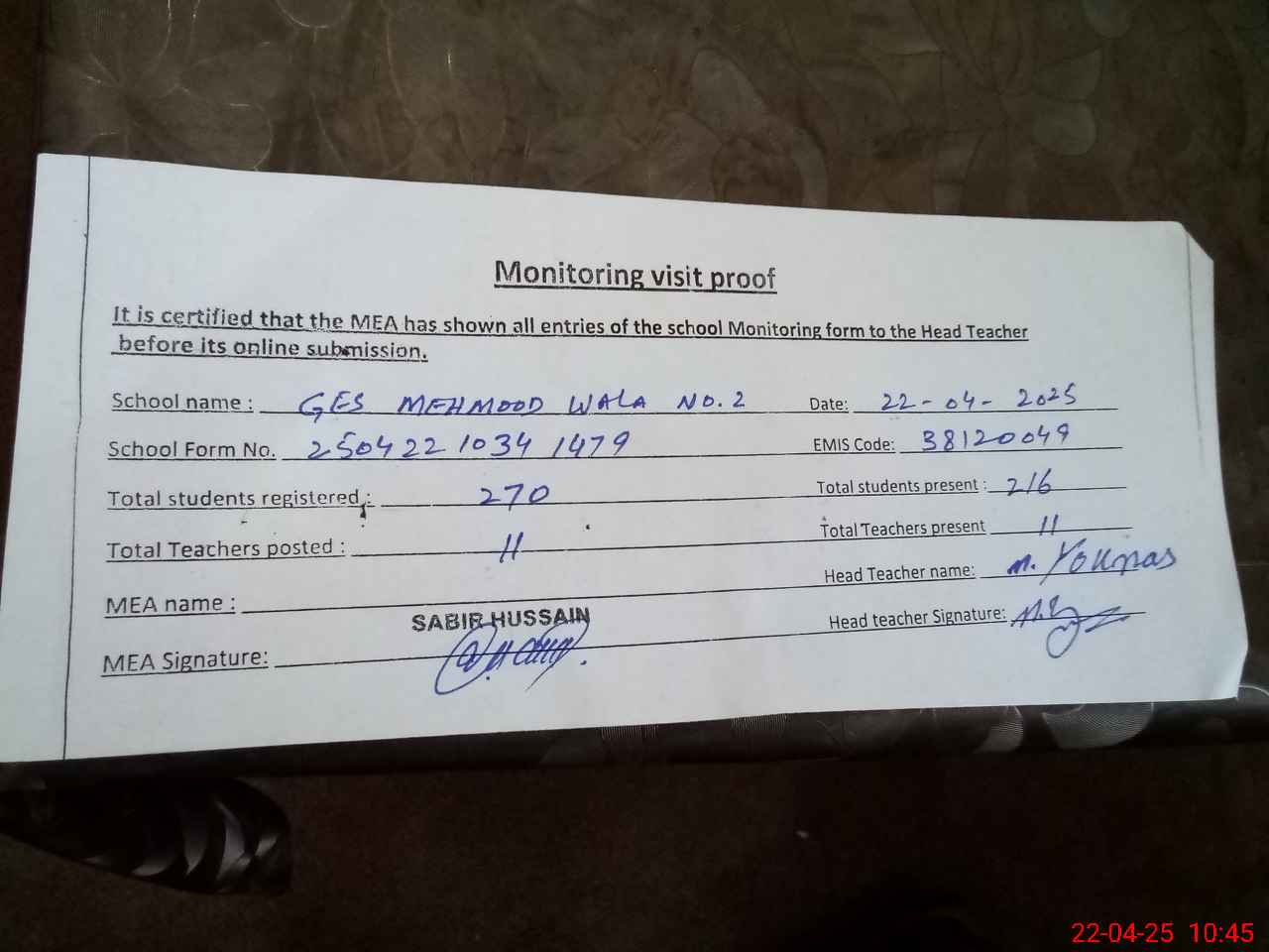 | EMIS Code: 38120049 | Name of School: GES MEHMOOD WALA NO 2 | |||