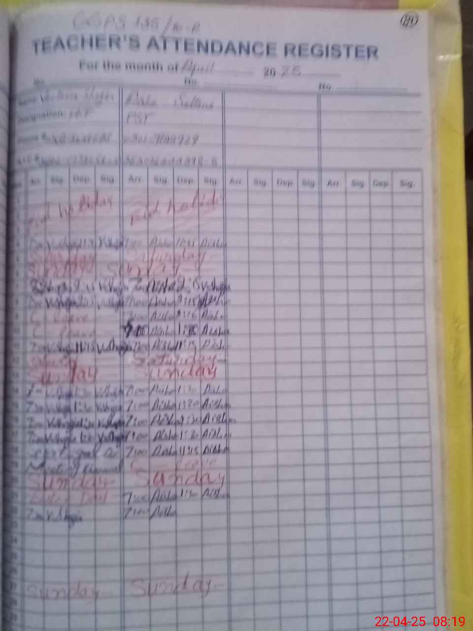 | CNIC | Full Name | Designation | R/C | Absence During Last Calender Month |