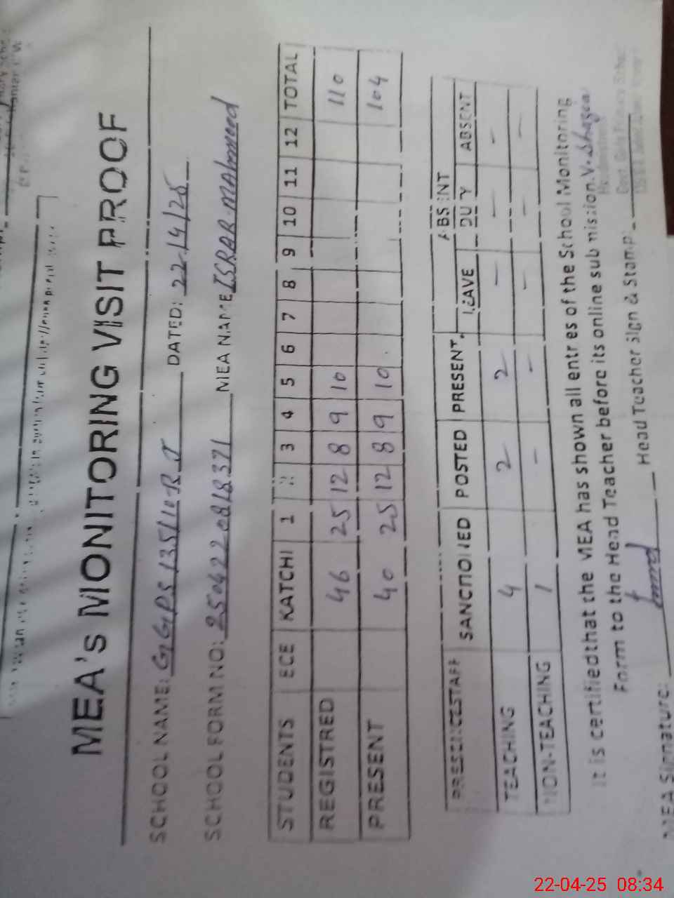 | Attendance Register | Head Teacher | MEA with School | Visit Proof |
