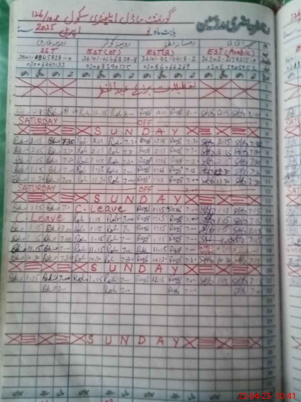 | Leave | Duty | Absent | Maternity | Medical | Ex- Pak |