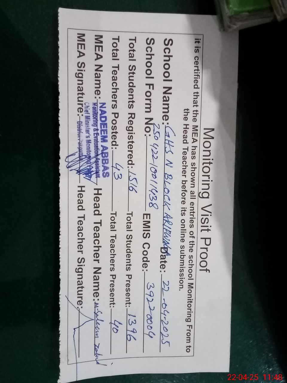 | EMIS Code: 39220004 | Name of School: GHS ARIFWALA N BLOCK | |||