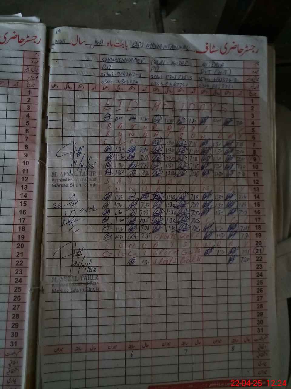 | CNIC | Full Name | Designation | R/C | Absence during last cal. month |