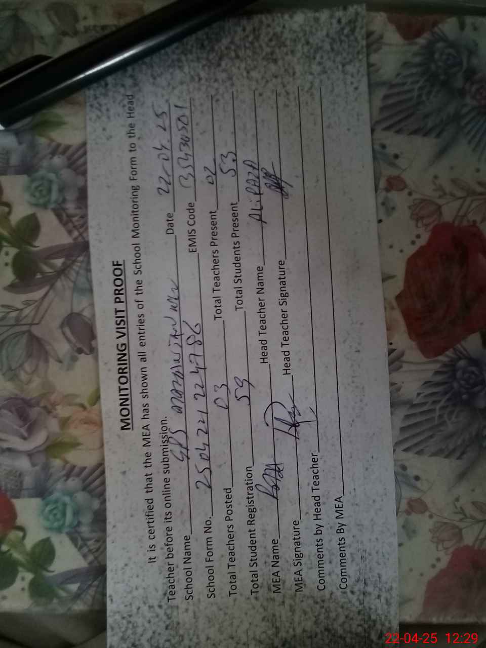 | Attendance Register | Head Teacher | MEA with School | Visit Proof |