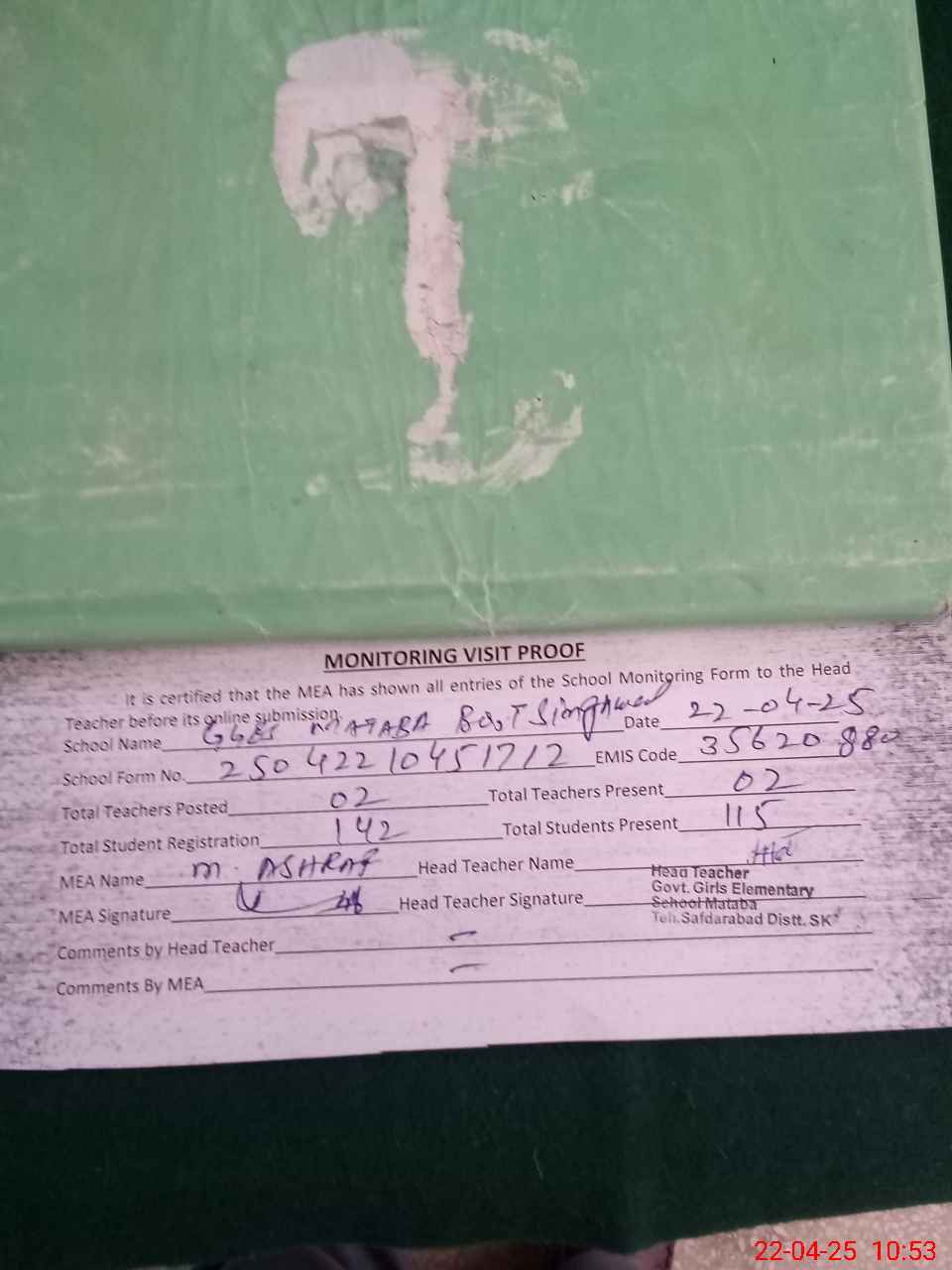 | Attendance Register | Head Teacher | MEA with School | Visit Proof |