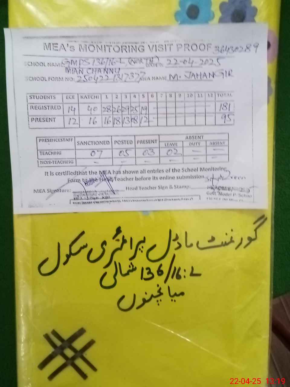 | EMIS Code: 36430289 | Name of School: GMPS 136/16-L NORTH, P/O 135/16-L STUNTZABAD, MIAN CHANNU | |||