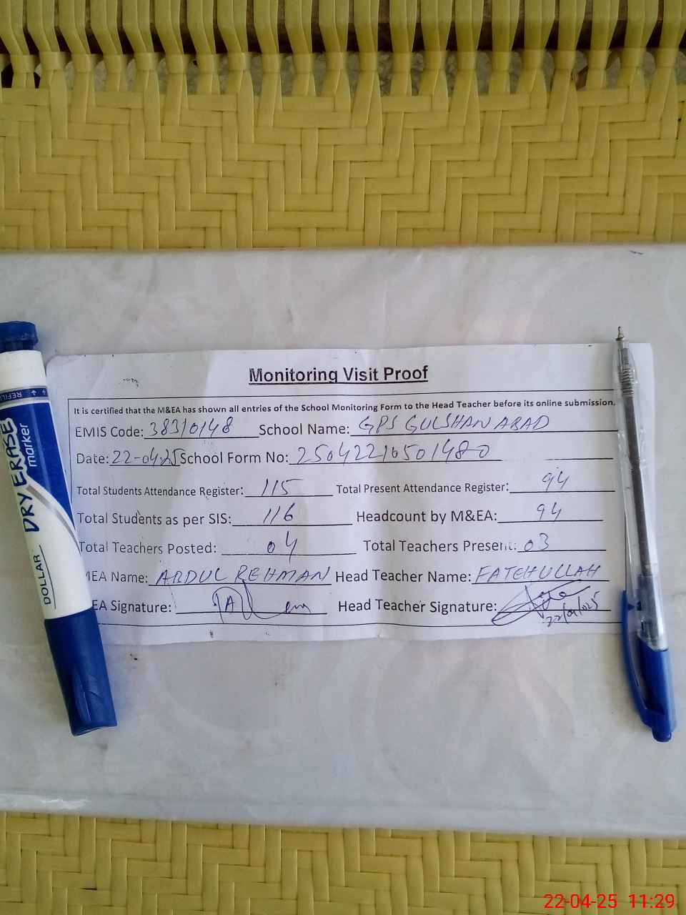 | Attendance Register | Head Teacher | MEA with School | Visit Proof |