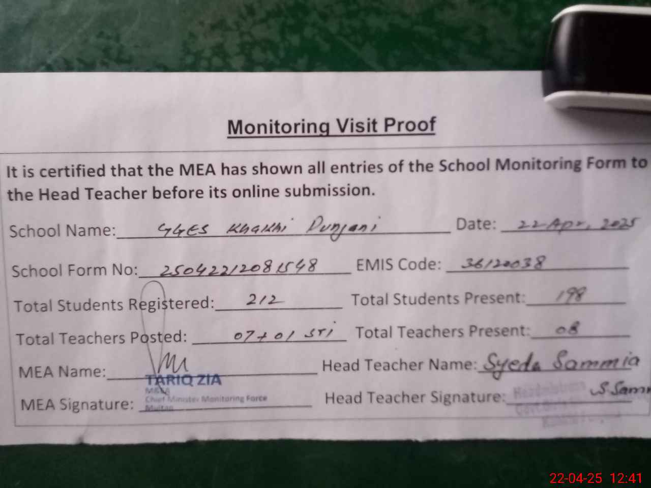 | Attendance Register | Head Teacher | MEA with School | Visit Proof |