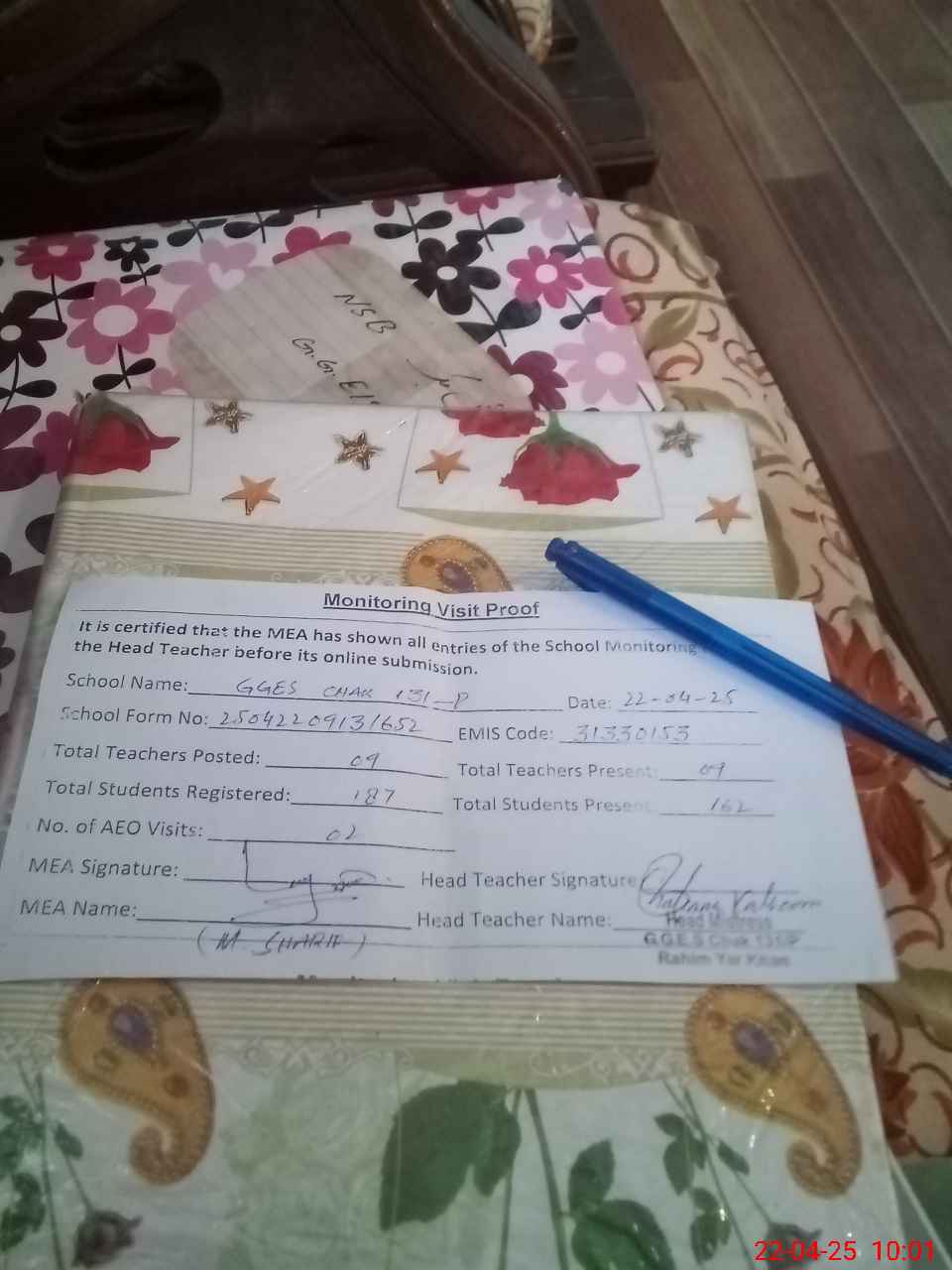 | Attendance Register | Head Teacher | MEA with School | Visit Proof |