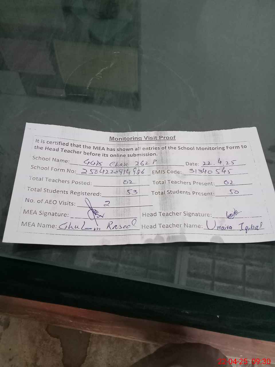 | Attendance Register | Head Teacher | MEA with School | Visit Proof |