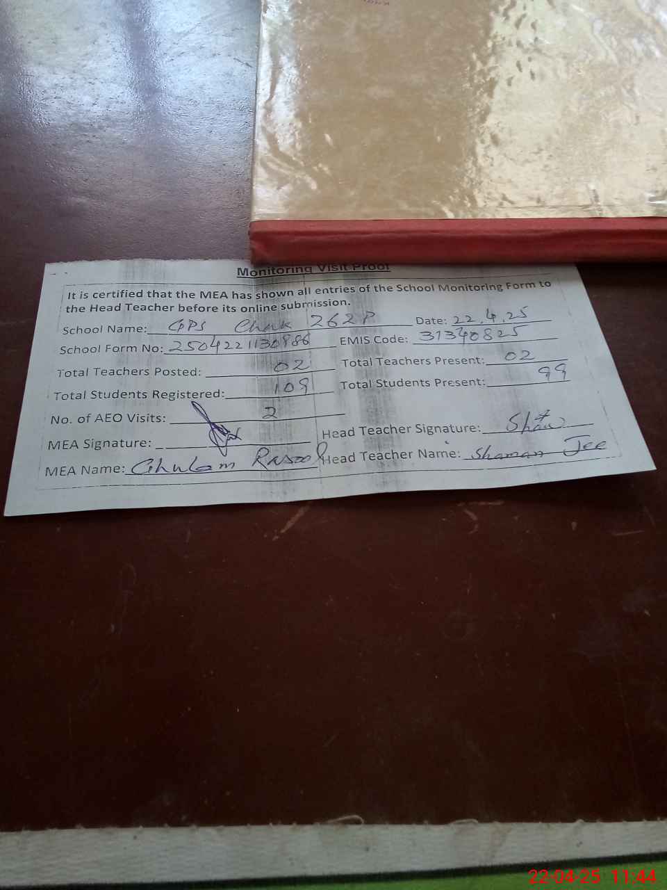 | Attendance Register | Head Teacher | MEA with School | Visit Proof |