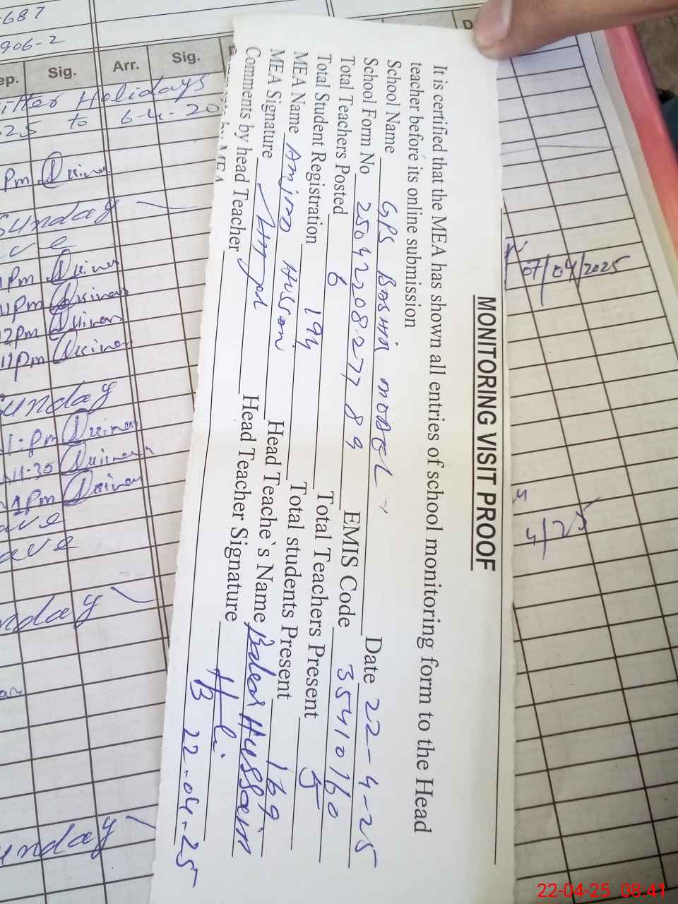| Attendance Register | Head Teacher | MEA with School | Visit Proof |