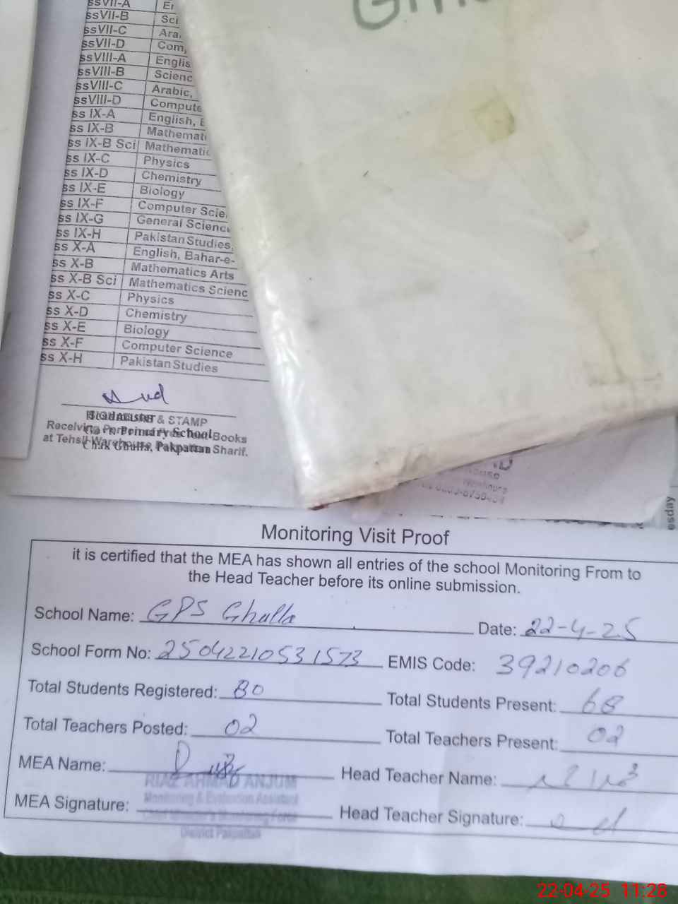 | EMIS Code: 39210206 | Name of School: GPS GHULLA P/O PAKPATTAN | |||