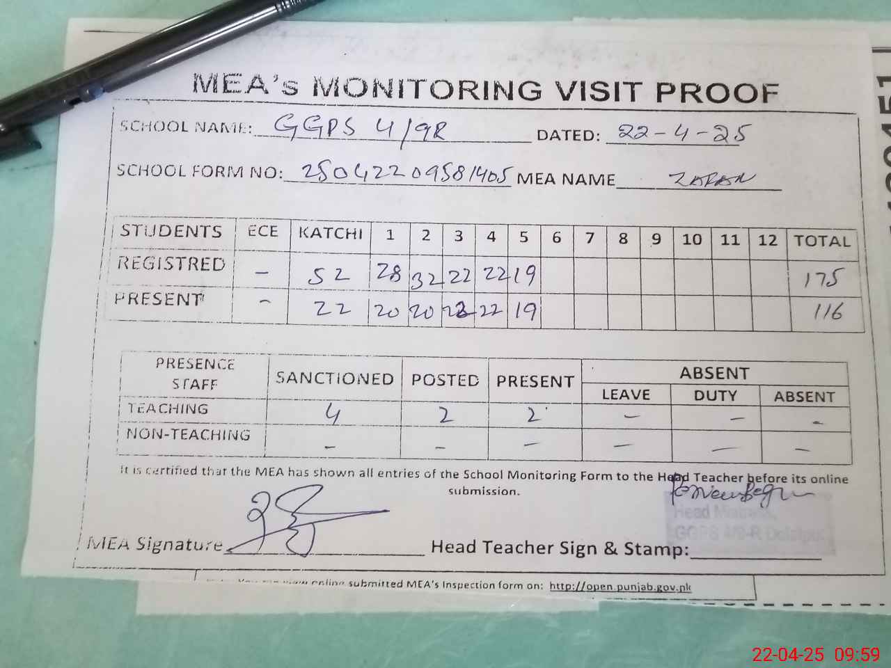 | Attendance Register | Head Teacher | MEA with School | Visit Proof |