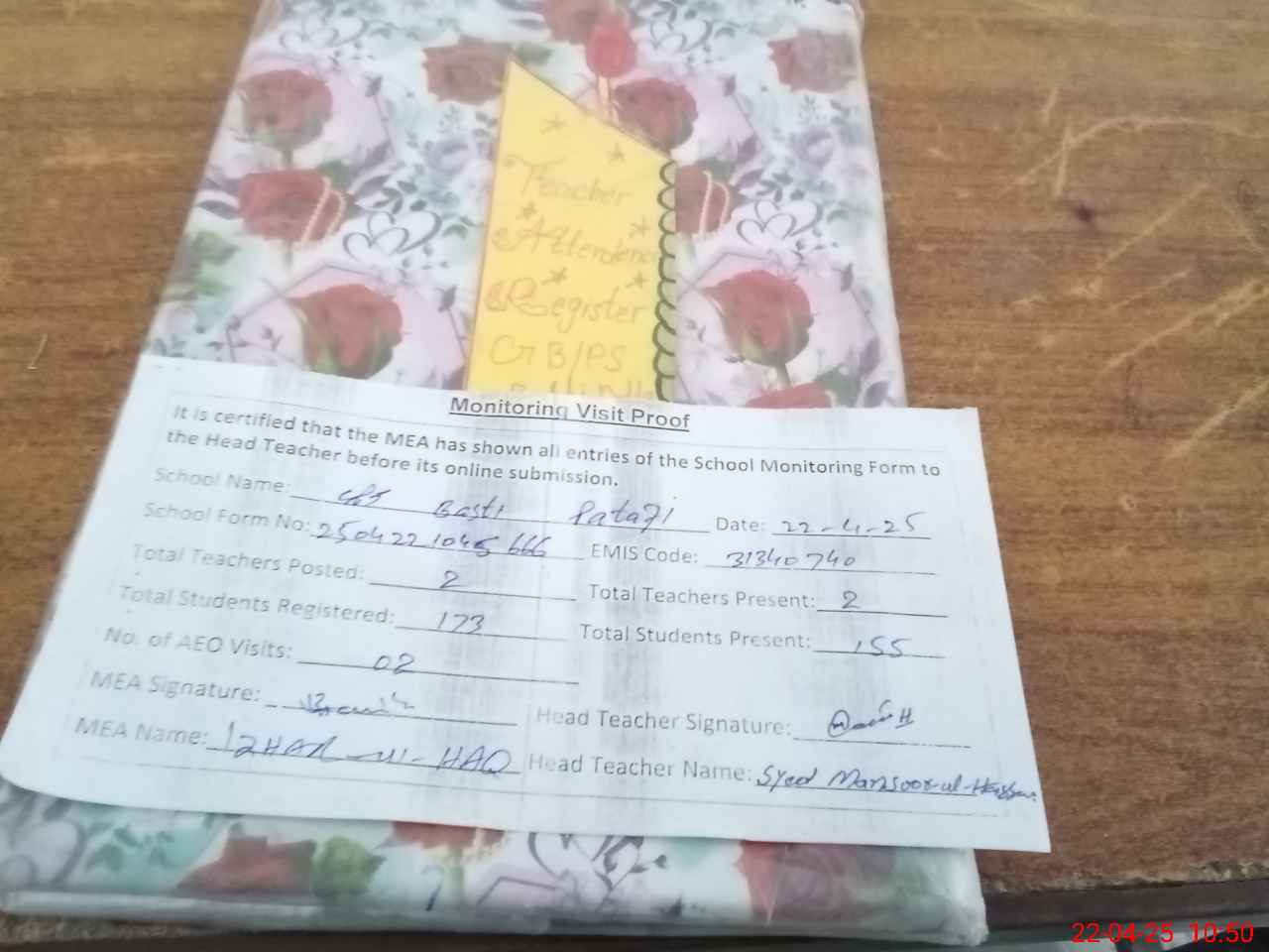 | Attendance Register | Head Teacher | MEA with School | Visit Proof |