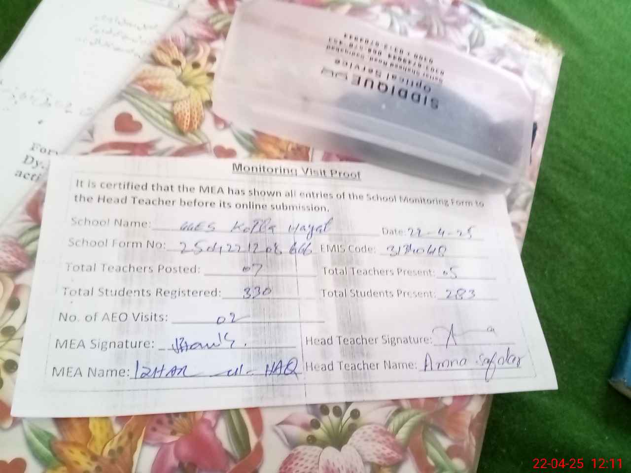 | Attendance Register | Head Teacher | MEA with School | Visit Proof |