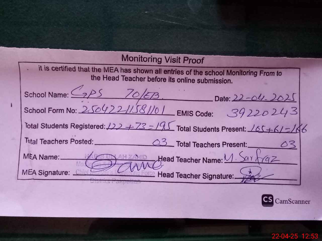 | EMIS Code: 39220243 | Name of School: GPS 70/EB ARIFWALA | |||