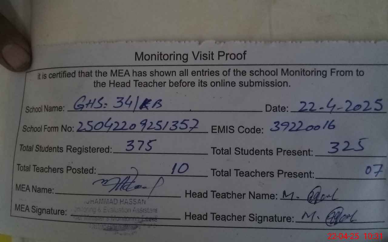 | EMIS Code: 39220016 | Name of School: GHS CHAK NO.34/KB | |||