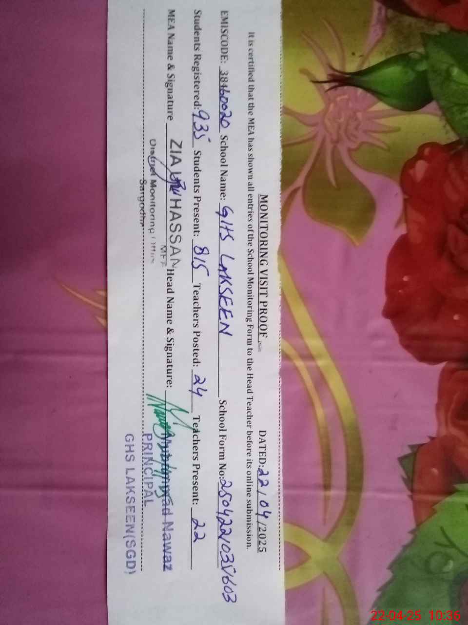 | Name: MU**** KH**** ME**** Designation: (School Headmaster's/Headmistress's) Principal Phone/Cell Number: 03**** |