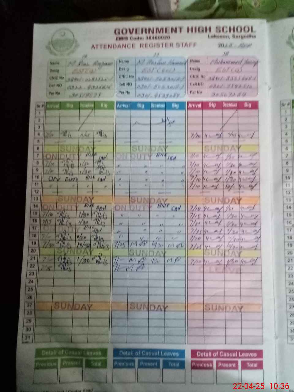 | CNIC | Full Name | Designation | R/C | Absence during last cal. month |