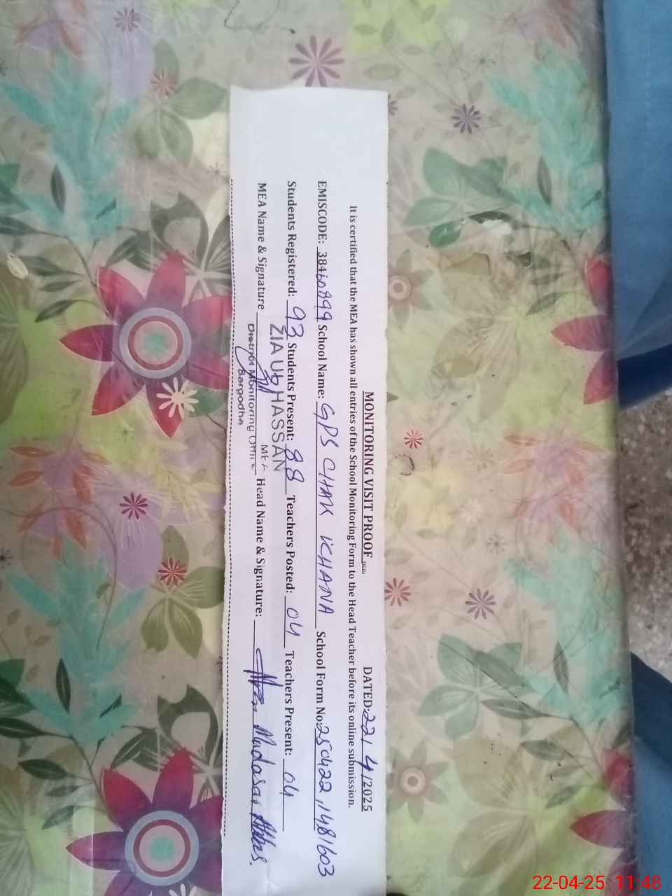 | EMIS Code: 38460899 | Name of School: GPS CHAK KHANA | |||