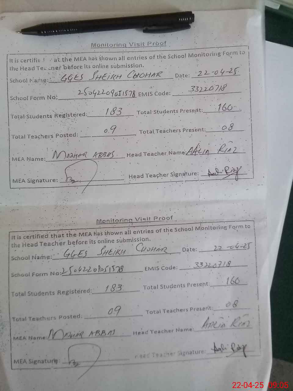 | Attendance Register | Head Teacher | MEA with School | Visit Proof |
