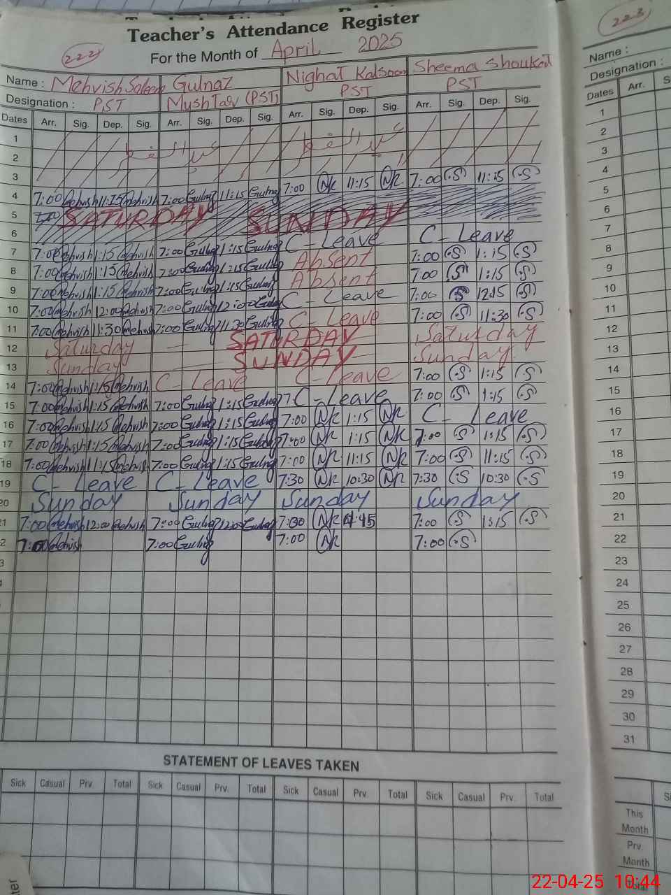 | Leave | Duty | Absent | Maternity | Medical | Ex- Pak |