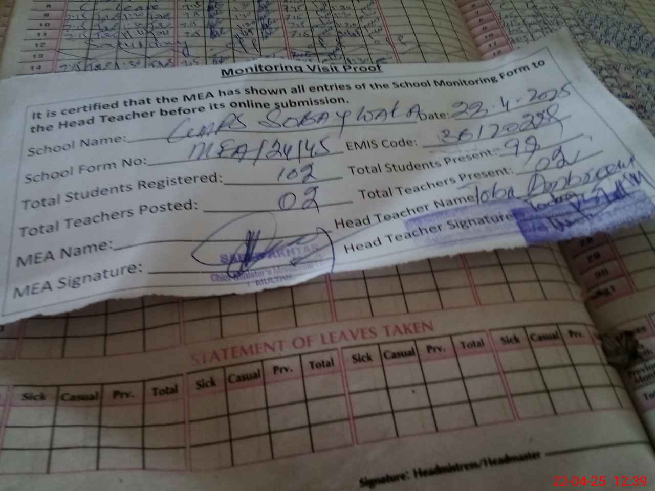 | Attendance Register | Head Teacher | MEA with School | Visit Proof |