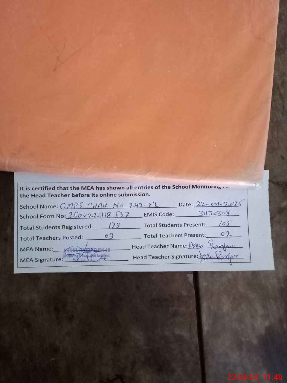 | Attendance Register | Head Teacher | MEA with School | Visit Proof |