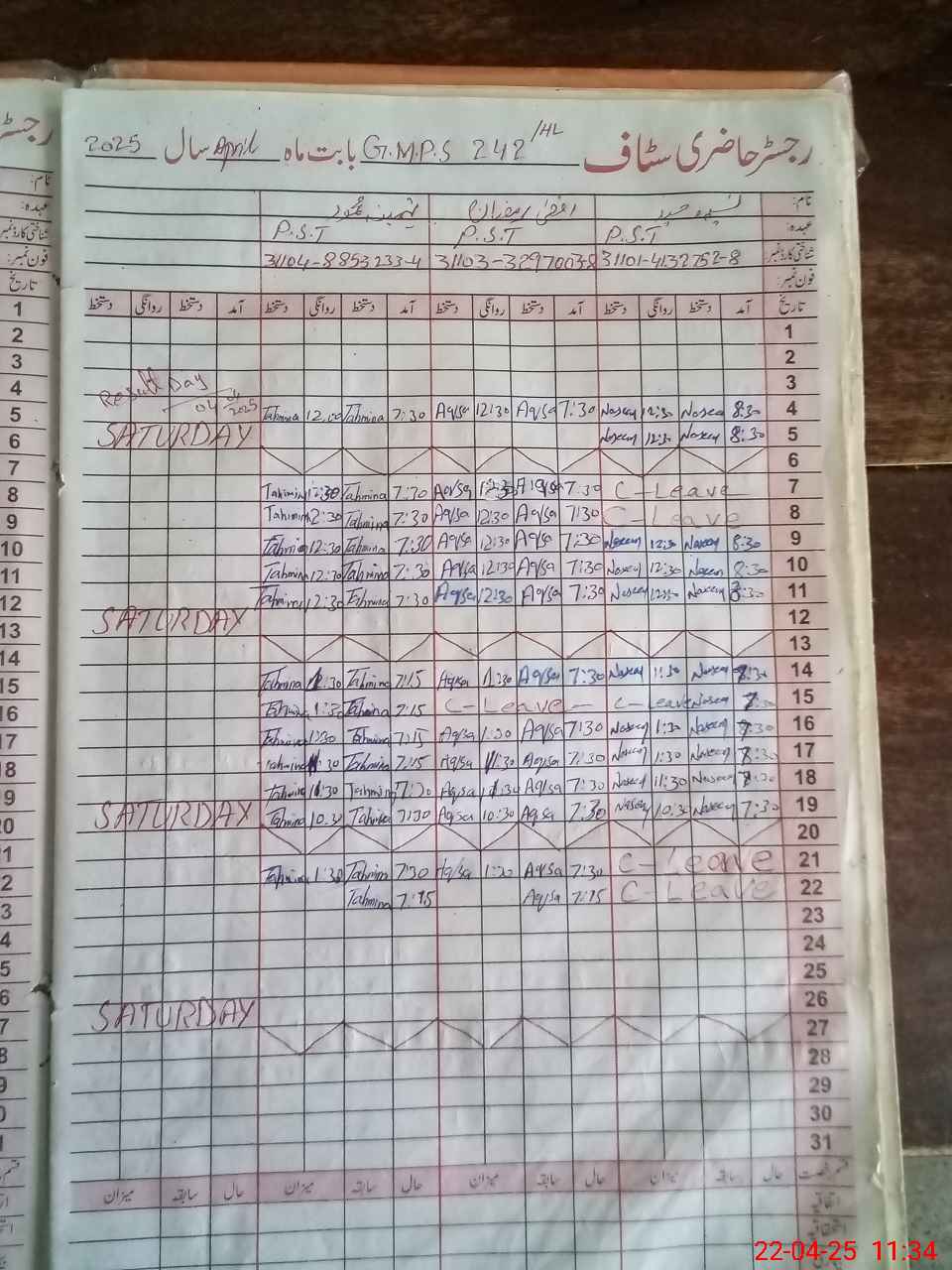 | CNIC | Full Name | Designation | R/C | Absence During Last Calender Month |