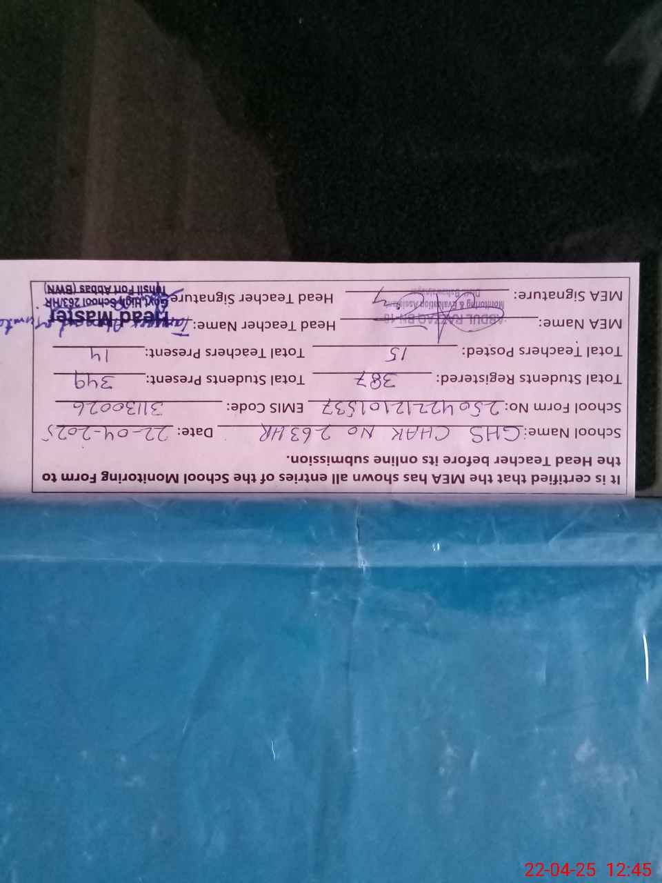 | EMIS Code: 31130026 | Name of School: GHS 263/HR | |||