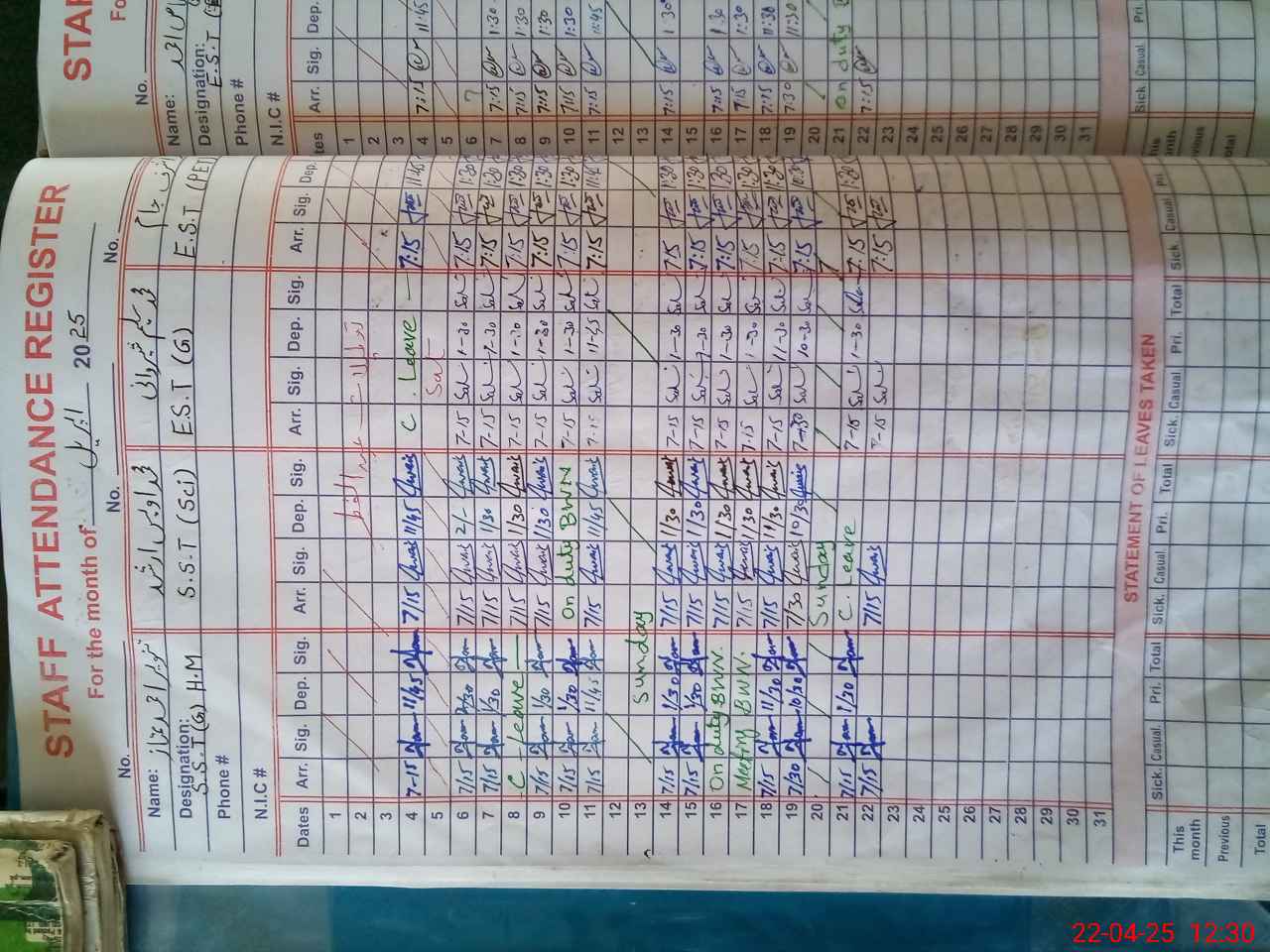 | CNIC | Full Name | Designation | R/C | Absence During Last Calender Month |