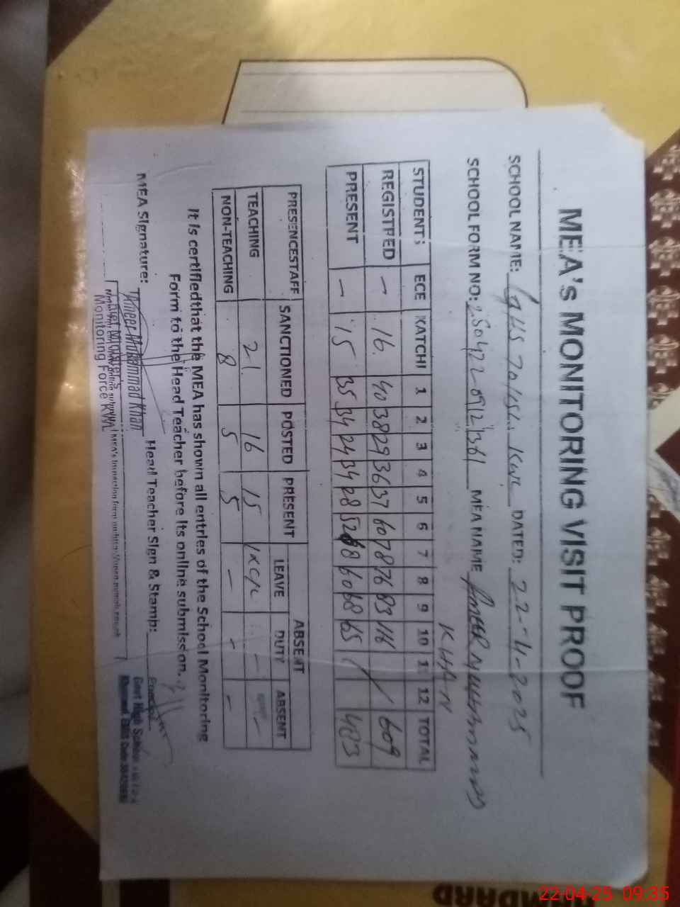 | Attendance Register | Head Teacher | MEA with School | Visit Proof |