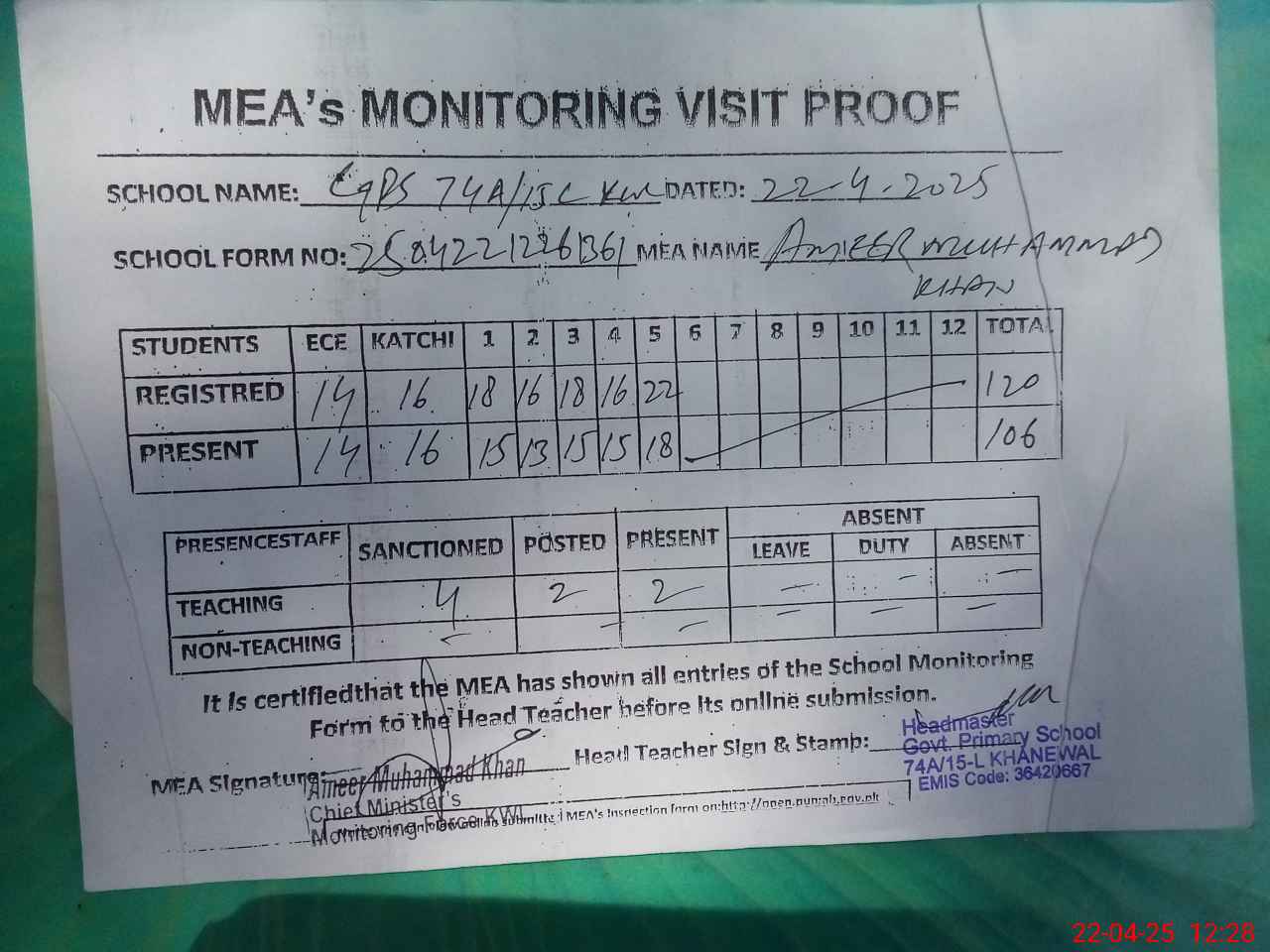 | EMIS Code: 36420667 | Name of School: GPS 74-A/15-L, KHANEWAL | |||