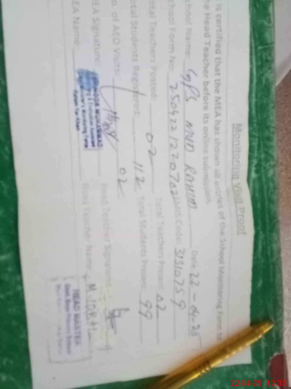 | Attendance Register | Head Teacher | MEA with School | Visit Proof |