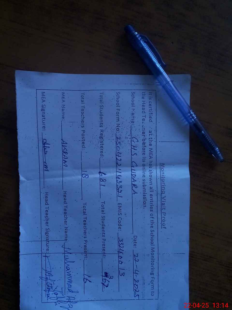 | Attendance Register | Head Teacher | MEA with School | Visit Proof |