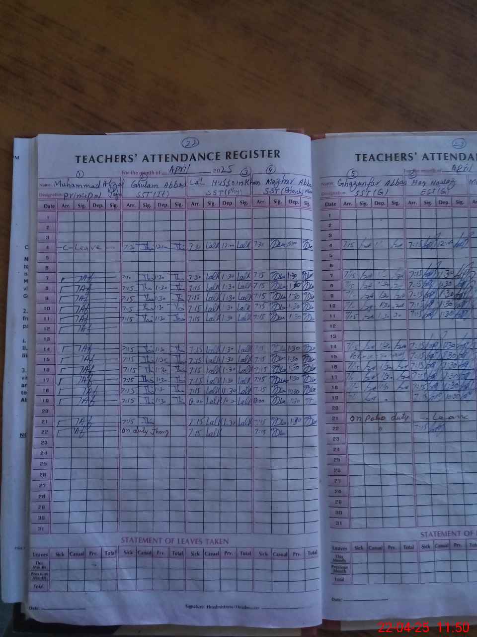 | CNIC | Full Name | Designation | R/C | Absence During Last Calender Month |