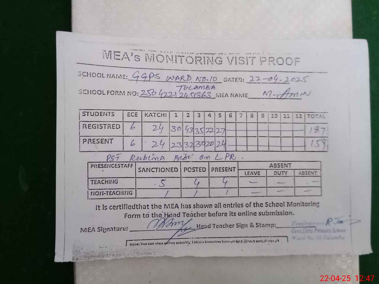 | Attendance Register | Head Teacher | MEA with School | Visit Proof |