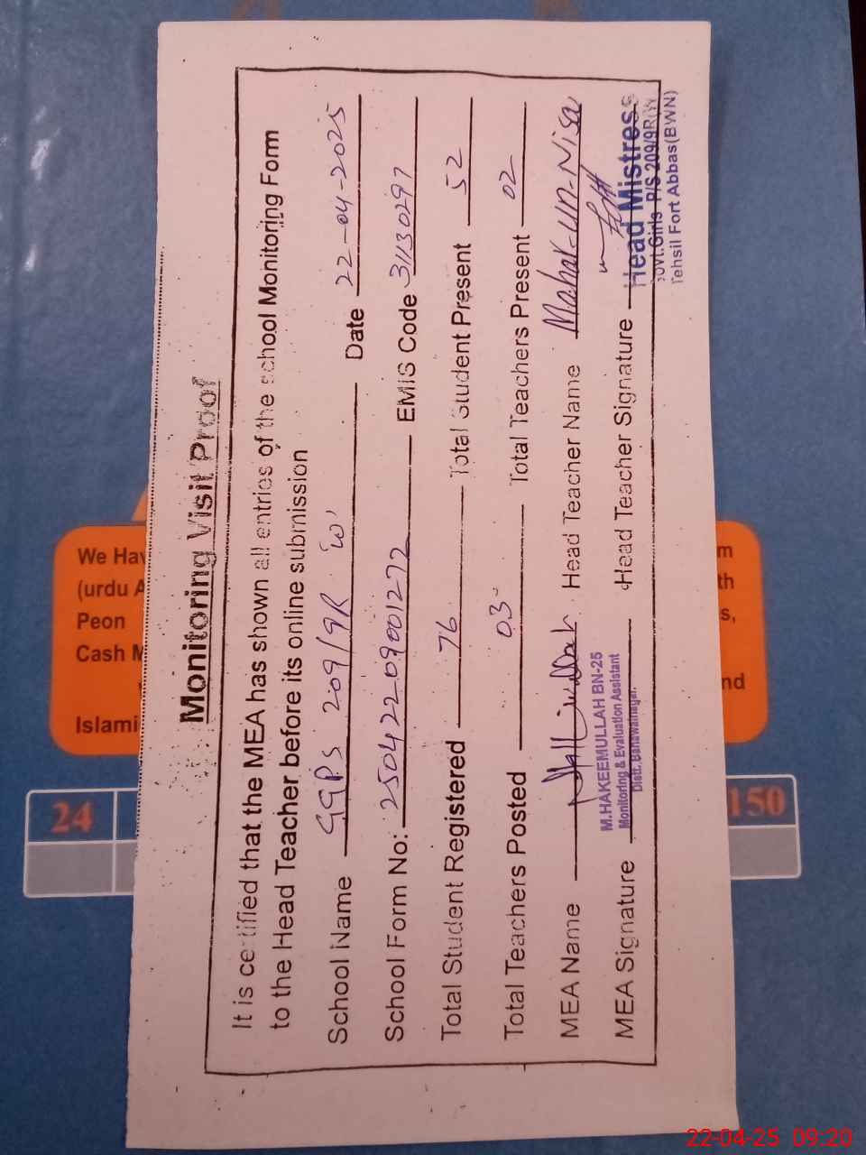 | District: BAHAWALNAGAR | Tehsil: FORT ABBAS | Markaz: FTS-IV-FEMALE | Level: Primary | |