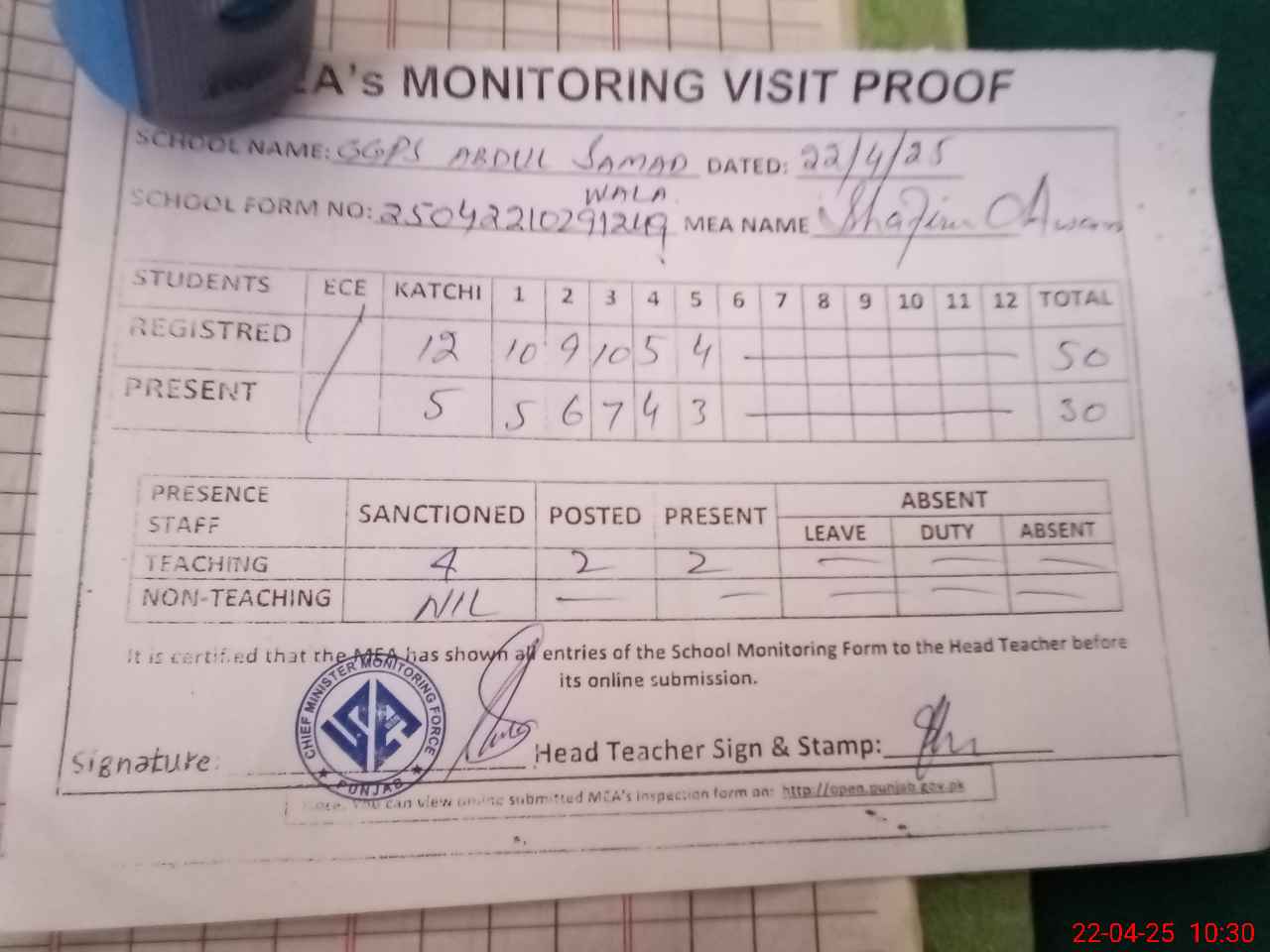 | Attendance Register | Head Teacher | MEA with School | Visit Proof |