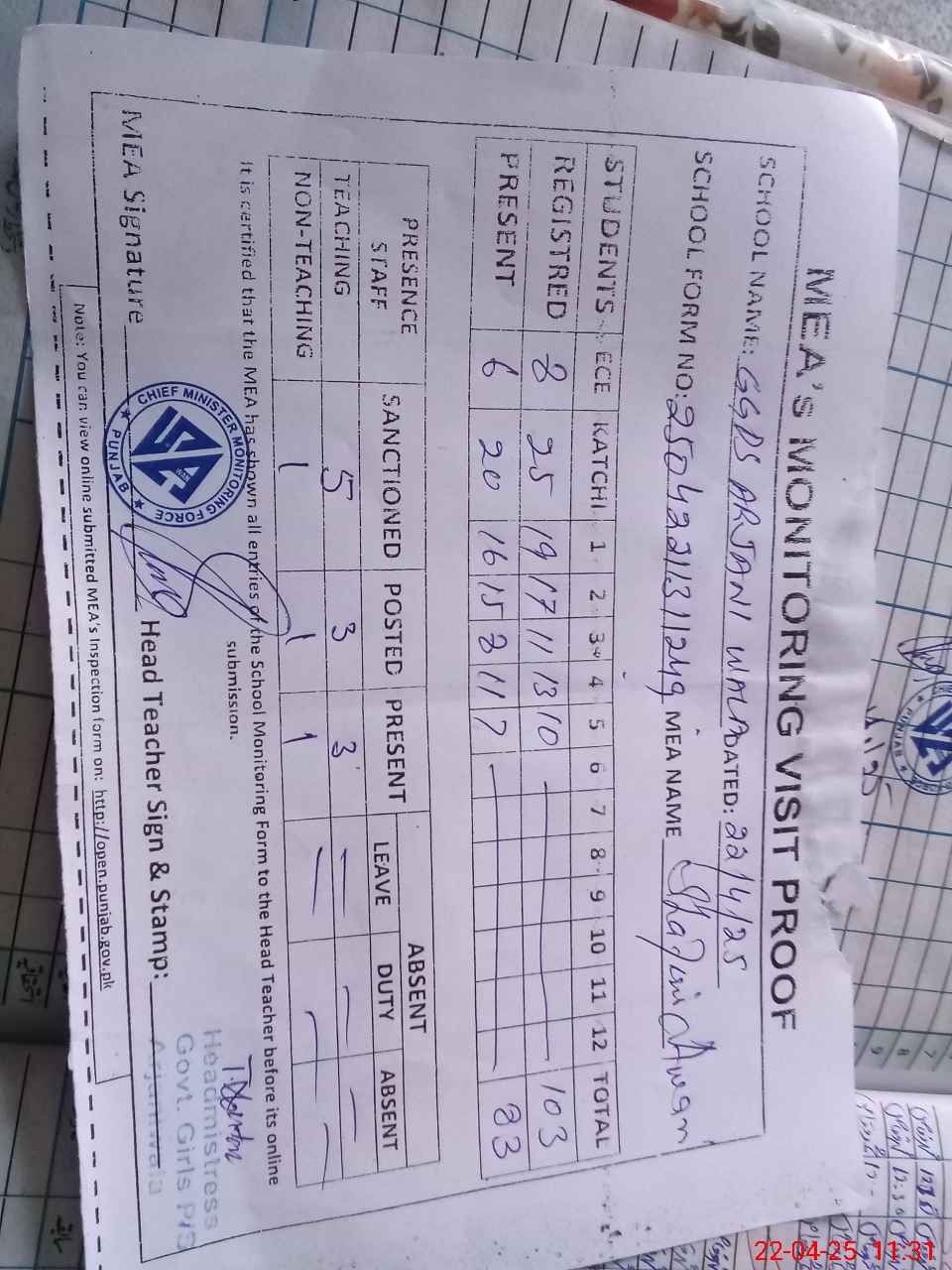 | EMIS Code: 36410423 | Name of School: GGPS ARJANI WALA NO.1 SARAI SIDHU | |||