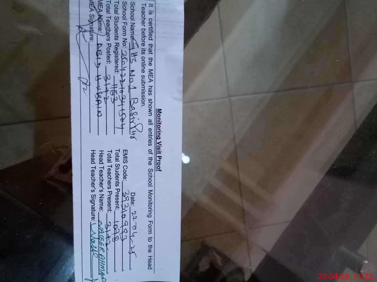| Attendance Register | Head Teacher | MEA with School | Visit Proof |