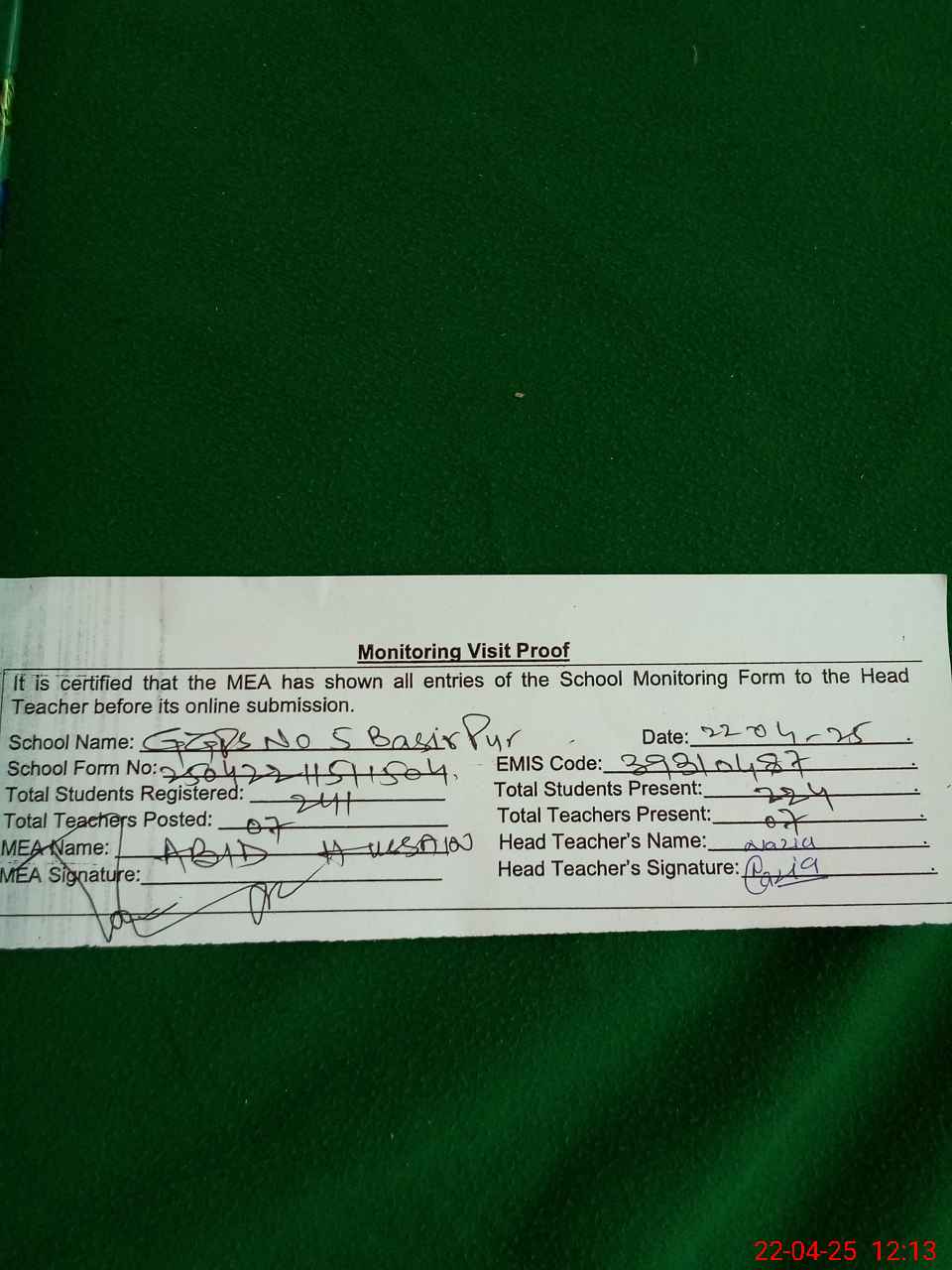 | EMIS Code: 39310487 | Name of School: GGPS NO. 5 BASIR PUR | |||